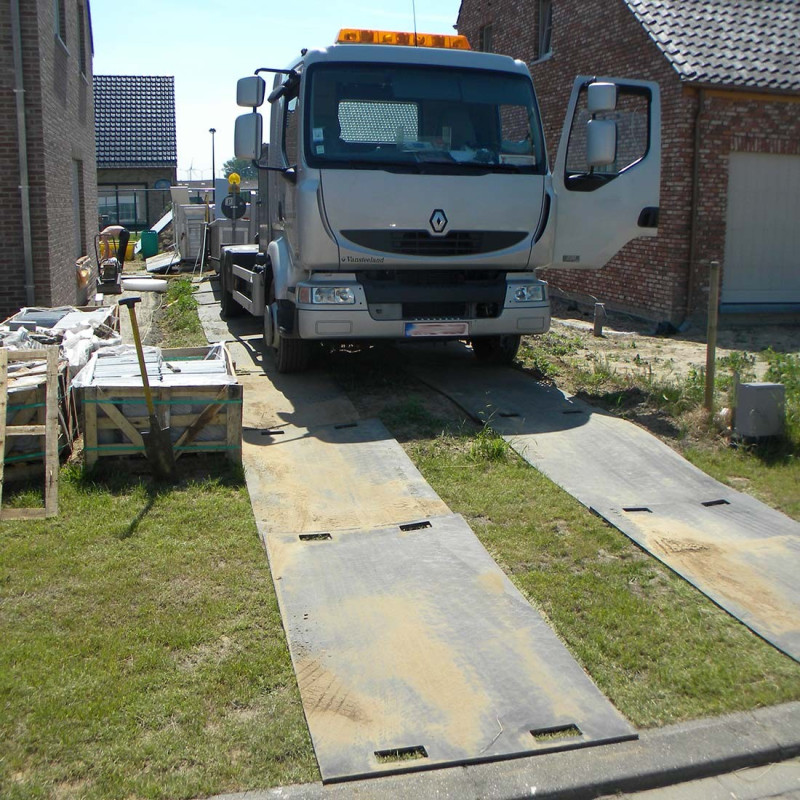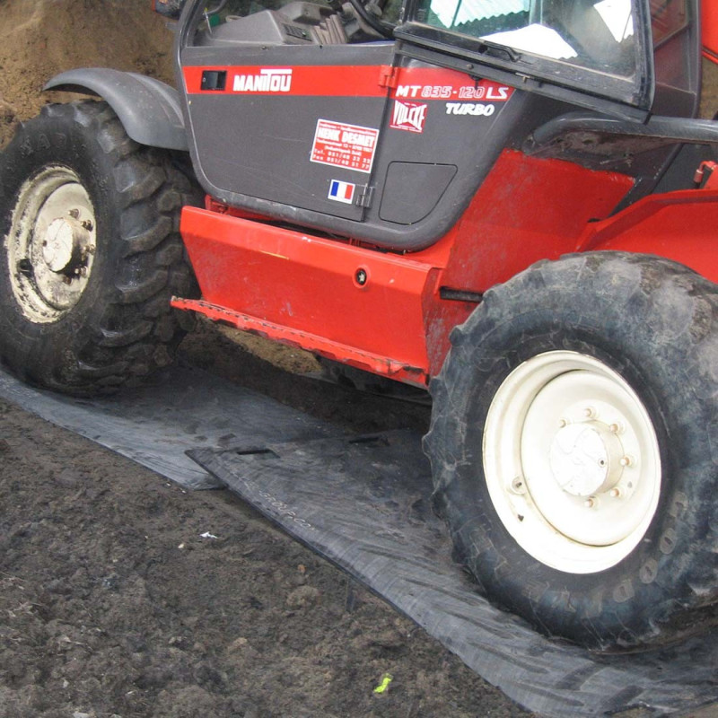 Lodax ground protection mat designed to protect delicate surfaces from the passage of heavy trucks, construction machinery, and tractors.