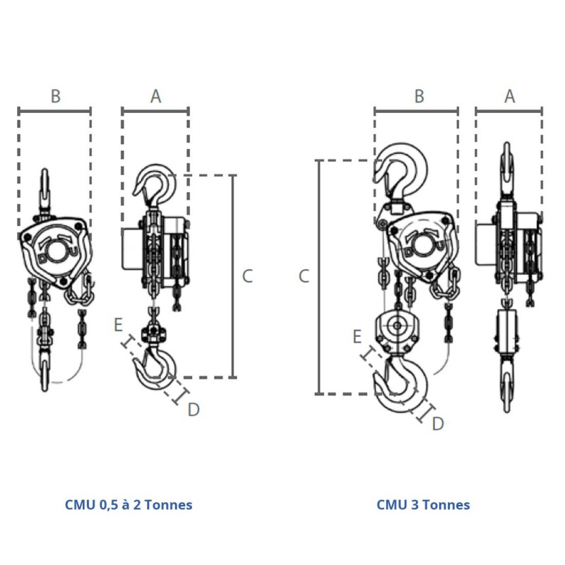 WLL (Kg) | Chaine (Øxmm) | Nb legs | Load factor (Kn) | max load(N) | Chain for 1-meter lift | Weight | A | B | C | D | E |