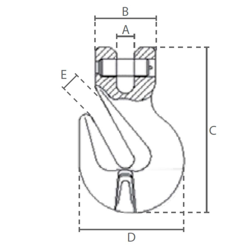 Ø chain (mm) | WLL (T) | Weight (Kg) | A | B | C | D | E |