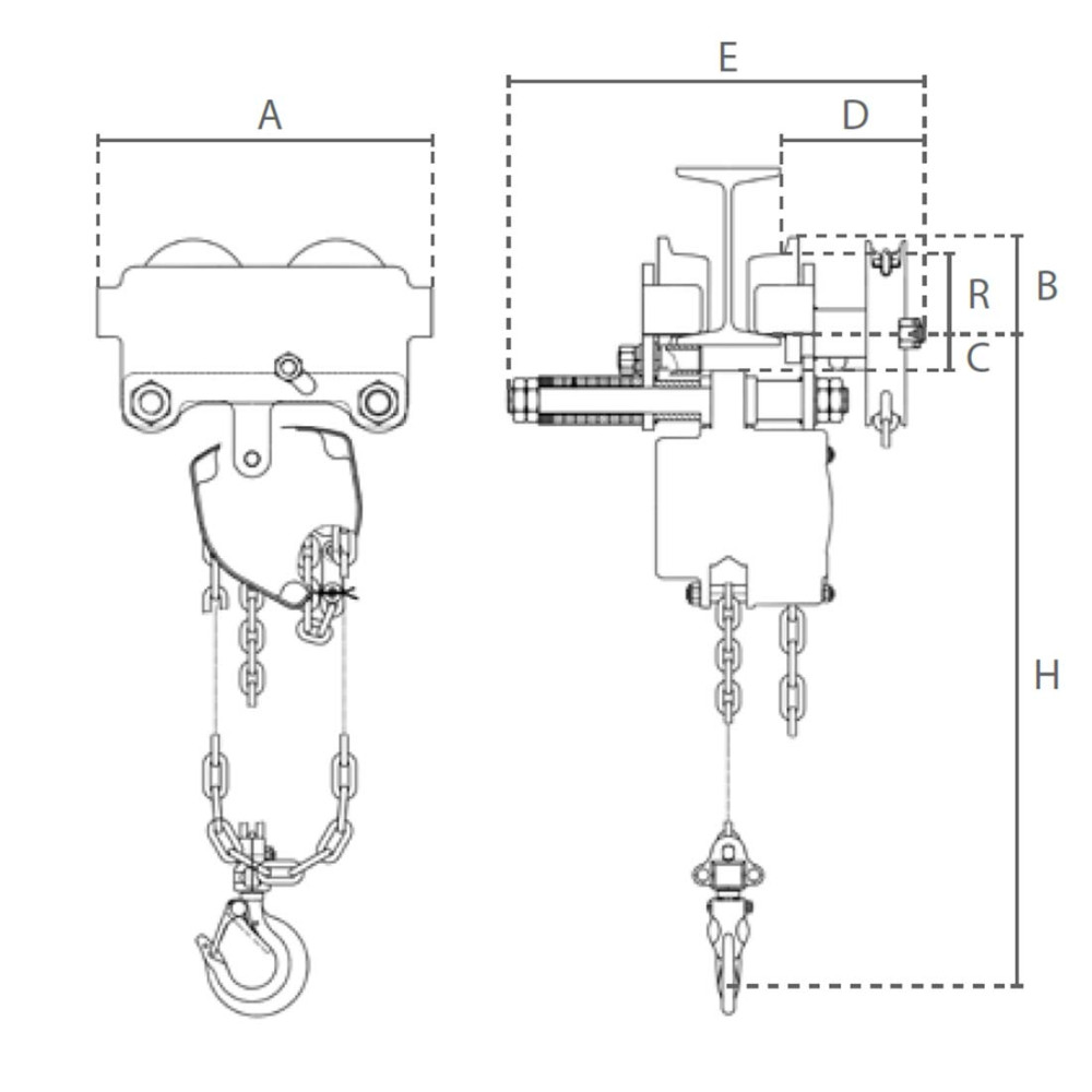| CMU (T) | Nb brins | Chaine de levage(mm) | Effort de chargement(N) | Chaine manuel pour 1m de levage (m) | Poids net(Kg) | Poids chaine (kg/m) | largeur poutre (mm) | rayon min.(mm) | A | B | C | D | E | H | R |