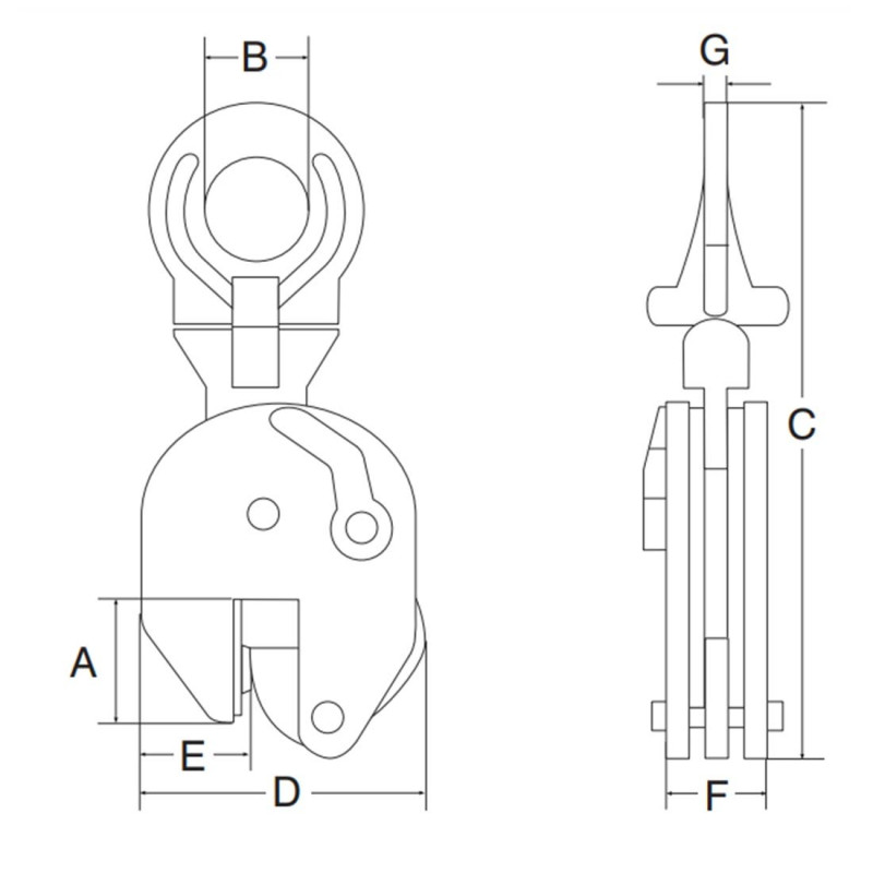 | CMU (Kg) | Ouverture (mm) | A (mm) | B (mm) | C (mm) | D (mm) | E (mm) | F (mm) | G (mm) | Poids(Kg) |