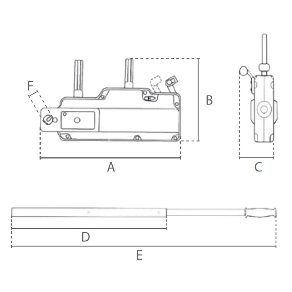 | Capacite en levage (Kg) | Capacite en traction (T) | Ø câble (mm) | Rupture câble (Kn) | Avancement du câble(mm) | Poids (Kg) | A | B | C | D | E | F |